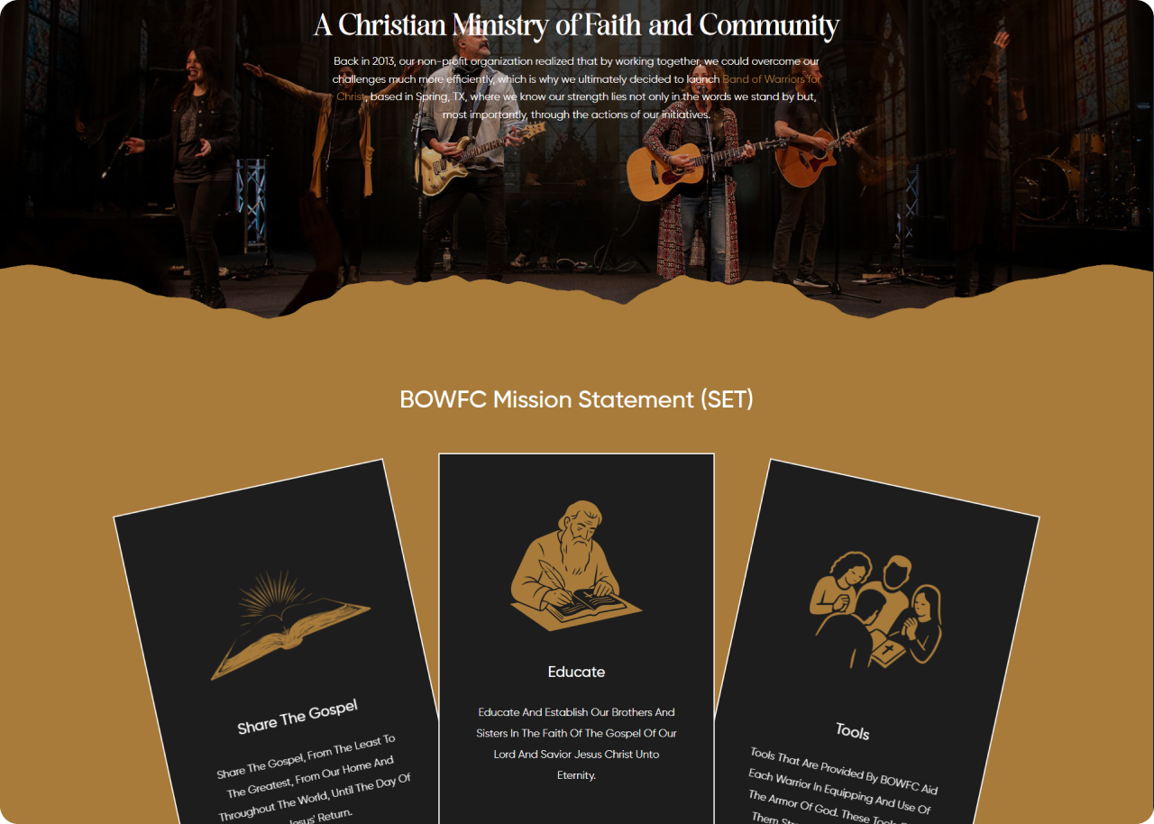 Band of Warriors for Christ (BOWFC) is a non-denominational Christian ministry based in Spring, TX focused on sharing the Gospel, Bible teaching, community outreach, and spiritual growth through worship services, Bible study, prayer support, and online resources.