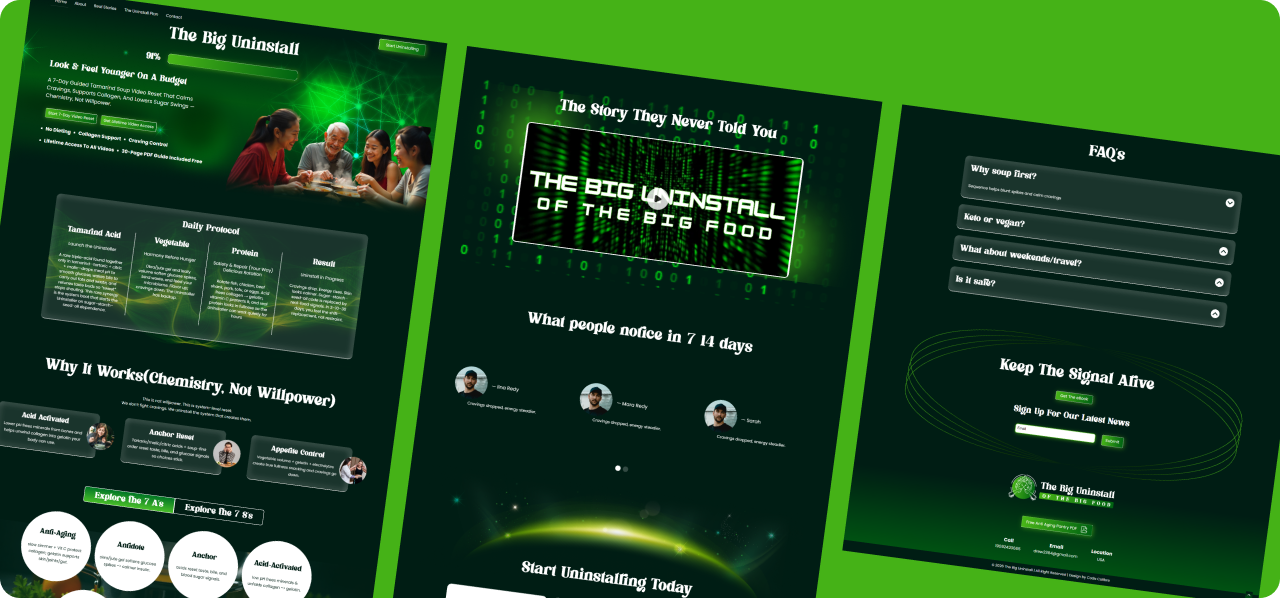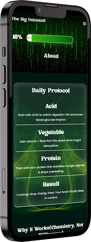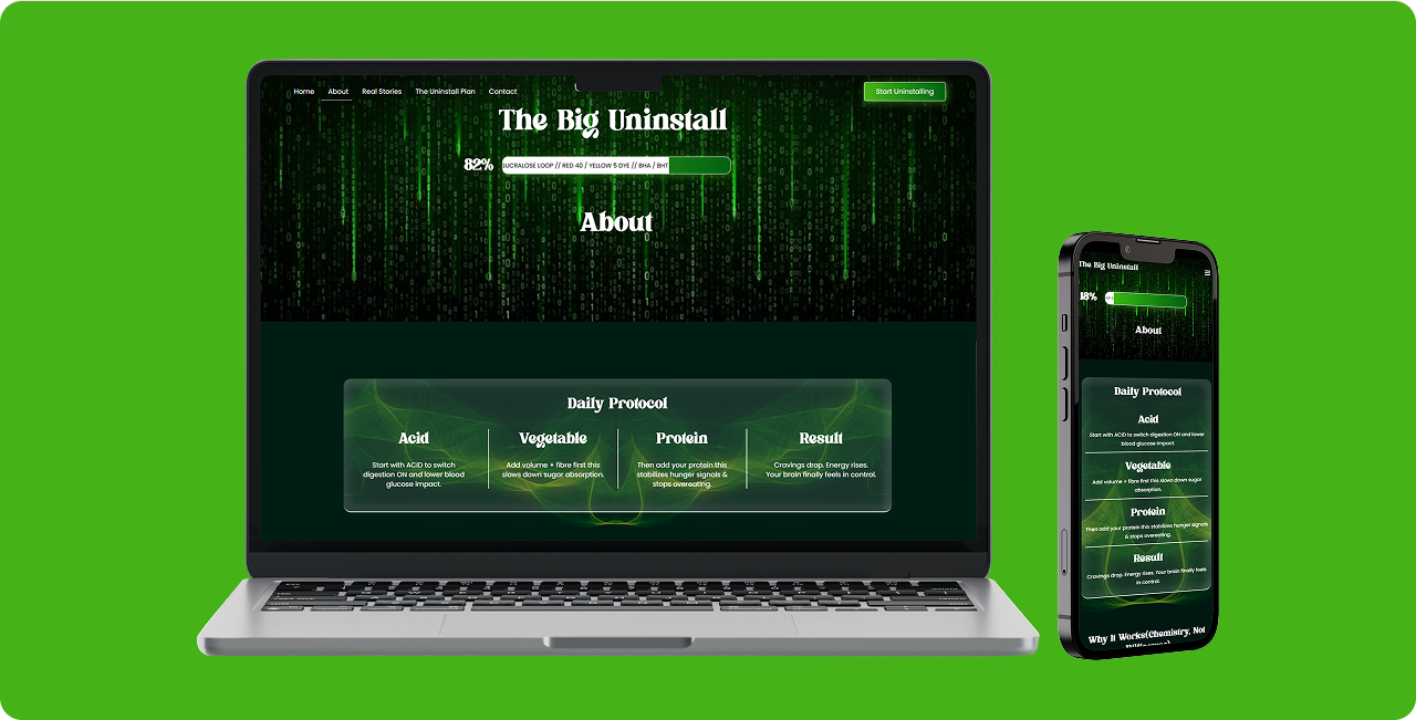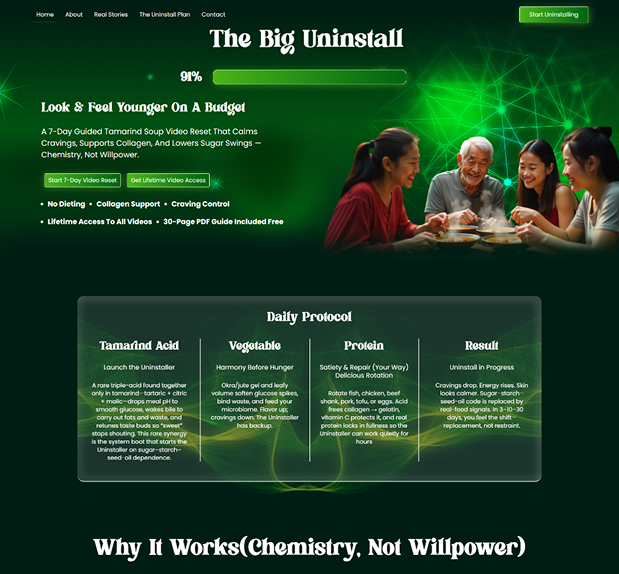 The Big Uninstall is a health and wellness site focused on a systematic approach to reducing cravings, improving digestion, stabilizing energy, and supporting overall balance through a structured “Uninstall Plan” that emphasizes food sequencing and body chemistry rather than willpower.